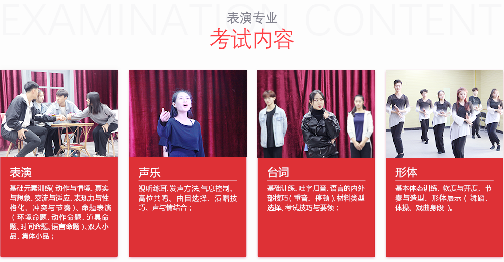 | 強(qiáng)化班 | 9.1-9.26 | 強(qiáng)化學(xué)生戲劇意識、找到符合邏輯的表演規(guī)律,使所塑造的人物更加真實(shí)、生動、有特點(diǎn)。 |