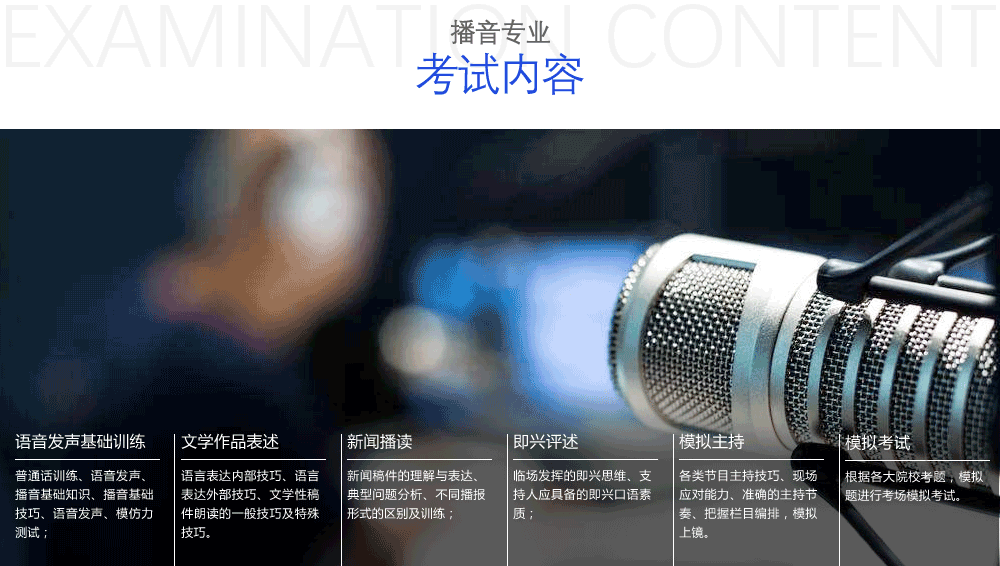 | 點(diǎn)睛班 | 11.24-12.15 | 有聲語(yǔ)言表達(dá)技巧,通過(guò)長(zhǎng)期訓(xùn)練,提高學(xué)生對(duì)文字,對(duì)稿件的把控和理解,讓學(xué)員朗讀稿件提高到一個(gè)更高更專業(yè)的水平上來(lái)。 |