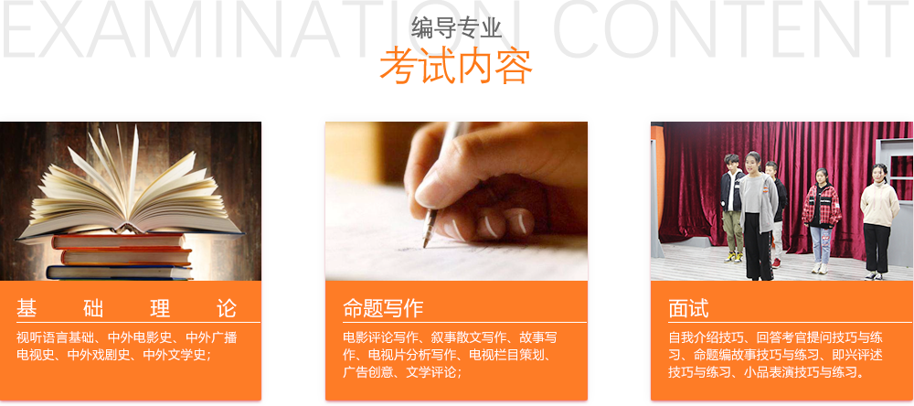 | 沖刺班 | 11.1-11.22 | 本階段課程針對校考和部分省份的統考,除基礎課以外,重點在電視板塊和閱讀鑒賞板塊。電視版塊課程中包括紀錄片、電視節目分析、電視節目策劃課程。 |