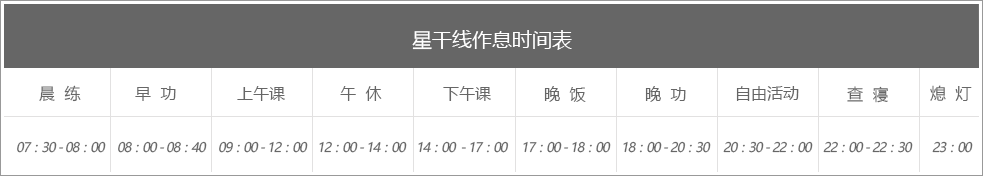| 五一游學營 | 5.1-5.5 | 針對不同層次、懷有傳媒藝術夢想的學員的一次體驗式教學活動,本次研學營從課程設置到師資搭配,都是星干線藝考里程碑式的配置,根據不同學員的自身素質、專業水平、文化課成績、意向報考院校等多方條件,對學員進行綜合考量測評,為學員量身定制一套科學系統的藝術成長之路,包括專業方向的選擇、學習規劃、課程安排。 |