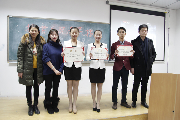 在展演開始前,針對上次播音系模擬測試的優異成績,教導處主任徐秀玫為三位優秀學員頒發了榮譽證書,播音系負責人徐進和其他兩位播音老師同獲獎學員合影留念。