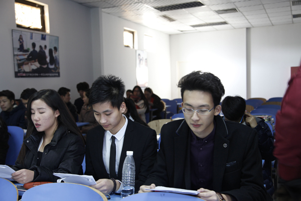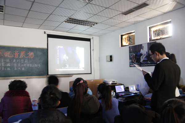 昨日下午兩點,播音系三個班的學員在編導教室進行了三段紀錄片配音展演。配音作品分別為:《連環雪崩》、《五大道》、《舌尖上的中國》。展演還邀請了表演班的老師和同學一同觀看,原本寬敞的教室被前來觀看的同學擠滿。