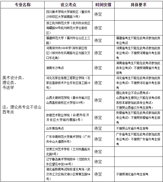 6、我校部分專業(yè)會(huì)在外省設(shè)立考點(diǎn),具體考試時(shí)間安排待確定后將陸續(xù)公布,考生可根據(jù)自身實(shí)際情況選擇考點(diǎn)。凡考生高考所在省設(shè)有考點(diǎn),考生只能在本省考點(diǎn)參加專業(yè)考試。外省考點(diǎn)所在省份有專門(mén)規(guī)定,考生須遵照?qǐng)?zhí)行。具體分布如下: