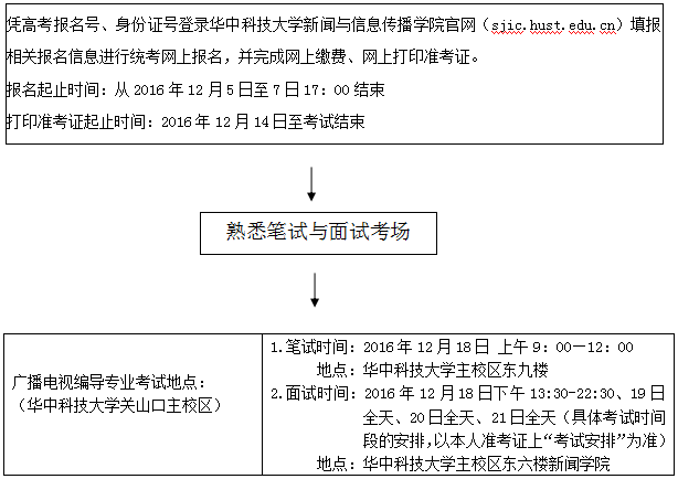 4.考生報名成功后,即可在2016年12月14日至考試結束期內憑報名號和身份證號登錄華中科技大學新聞與信息傳播學院官網(sjic.hust.edu.cn),下載打印準考證。考生必須按照準考證上規定的時間、地點等考試要求參加相關筆試、面試。
