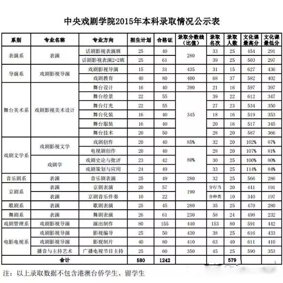 中戲2015年各專業(yè)發(fā)證數、分數線及錄取最后名次