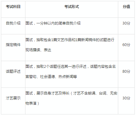 考試共設4個科目。分別考察考生的外貌形體及形象氣質、語音條件及語言表現力、思維反應及語言組織能力、藝術感悟及藝術特長。專業成績滿分為200分。考試科目具體分值如下: