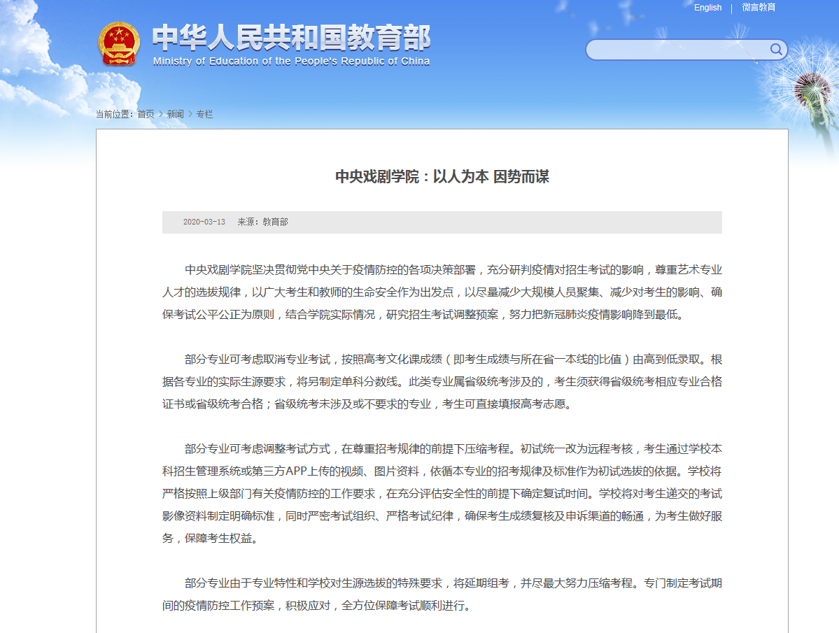 教育部官網13日發布文章稱,1)中央戲劇學院部分專業可考慮取消專業考試,按照高考文化課成績由高到低錄取;2)部分專業可考慮調整考試方式,在尊重招考規律的前提下壓縮考程;3)部分專業由于專業特性和學校對生源選拔的特殊要求,將延期組考,并盡最大努力壓縮考程。
