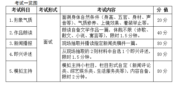 按照廣播、電視、網絡等電子傳媒受眾的基本審美標準,綜合考察考生的身體自然條件、氣質修養、上鏡效果、著裝舉止等情況。