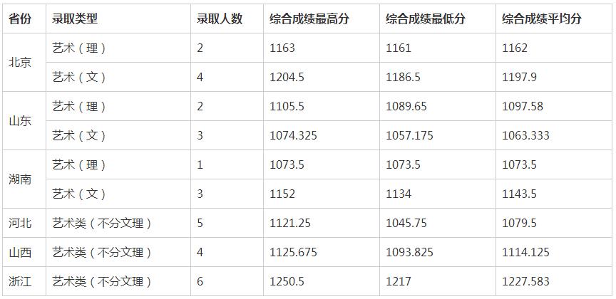 注:(1)實行非平行志愿投檔的省份,對于投檔考生根據我校在該省份的招生計劃按照考生綜合成績從高到低擇優錄取(文理分科制定計劃數的省份,文理科按照招生計劃數分別排隊;文理不分科制定計劃數的省份,文理科一起排隊)。綜合成績=高考文化課成績+(美術類省級統考成績/美術類省級統考滿分)×750。綜合成績相同的考生,優先錄取高考文化課成績高的考生。