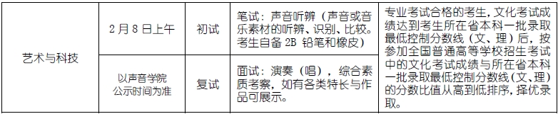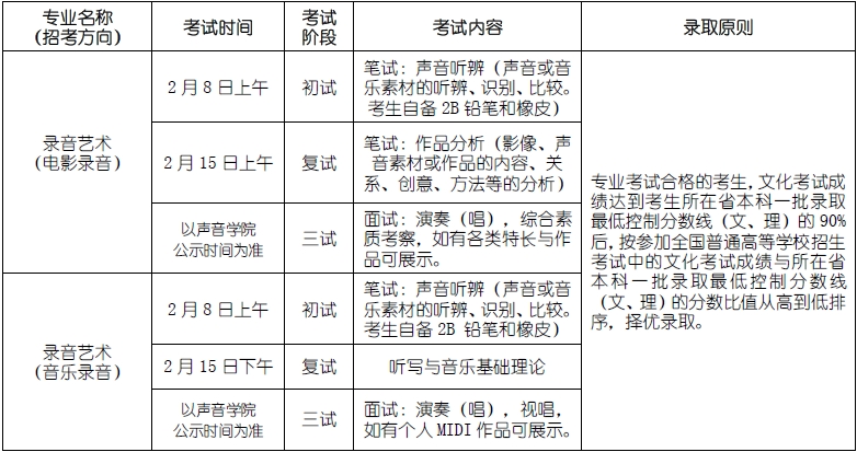 注意事項:報考錄音藝術(shù)專業(yè)、藝術(shù)與科技專業(yè)的考生,除鋼琴外,其他演奏樂器自備。演唱、演奏無需伴奏。