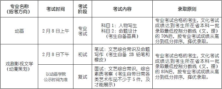專業(yè)要求: 報考動畫專業(yè)的考生,要求聽力正常,無色盲、色弱。 報考戲劇影視文學專業(yè)(動漫策劃)的考生要求聽力正常。