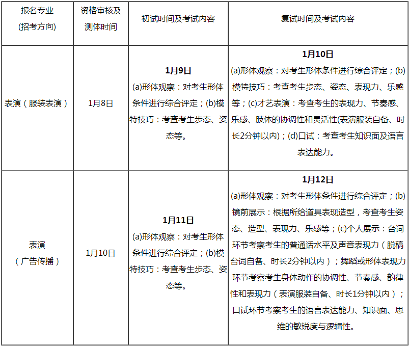 注:測體及初試、復試地點均在北京服裝學院櫻花園校區(北京市朝陽區櫻花東街甲2號),具體地點以準考證為準。考試要求詳見《北京服裝學院2018年表演專業考生須知》。