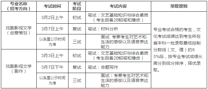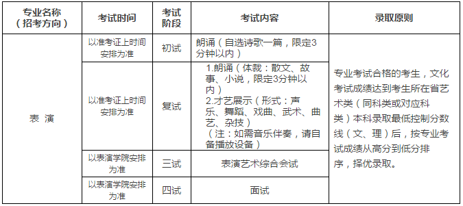 注意事項:報考表演專業的考生,參加專業考試時:一律不許化妝,嚴禁穿著增高鞋,使用增高墊;進入三試參加專業考試時請自備形體練功服、平跟軟底鞋。戲劇影視表演專業,初試進入復試合格線依據表演學院劃定的合格線為準;復試進入三試的合格線依據高等職業教育學院劃定的合格線為準。進入高等職業教育學院三試的考生,需要參加高等職業教育學院組織的三試考試。