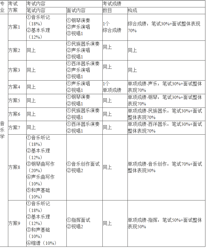 音樂學專業考試根據考試科目不同,共有9種方案。每種考試方案均包含筆試和面試。考生從9種方案中選擇一種進行考試。