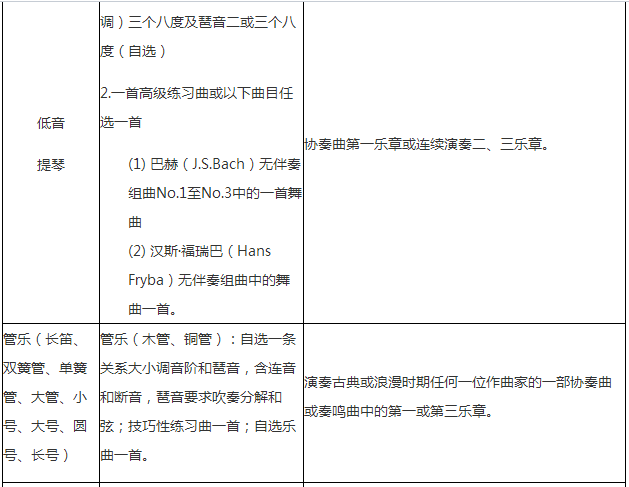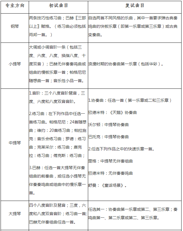 注:所有演奏(唱)專業(yè)曲目均須背譜;報名系統(tǒng)中填寫的曲目不可現(xiàn)場臨時更改,如測試演奏(唱)曲目與最終提交曲目不符的,將在測試評審時扣分;報考小提琴專業(yè)的考生可以兼報中提琴。
