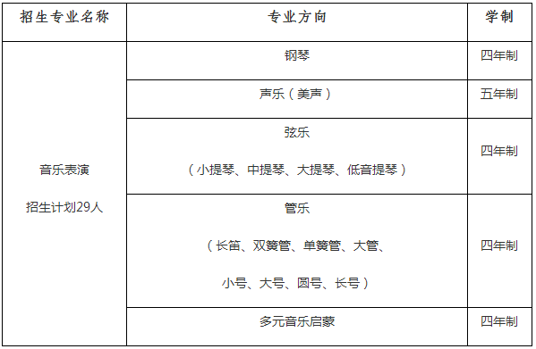 說明:音樂表演專業(yè)招生不做分省計劃。專業(yè)測試結(jié)束后,根據(jù)實際生源情況,堅持寧缺勿濫的原則,確定各專業(yè)方向的合格生人數(shù)。報考小提琴專業(yè)的考生可以兼報中提琴。
