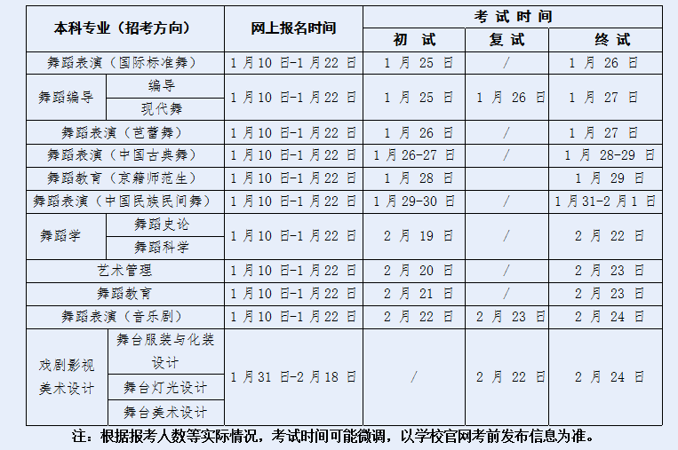 注:舞蹈教育專業(yè)兩個(gè)招考方向考試內(nèi)容相同,考試時(shí)間不同。舞蹈教育(京籍師范生)的京籍考生需在初試檢錄時(shí)提供本人戶口本原件及復(fù)印件(復(fù)印首頁(yè)及個(gè)人頁(yè)),且對(duì)材料的真實(shí)性負(fù)責(zé)。