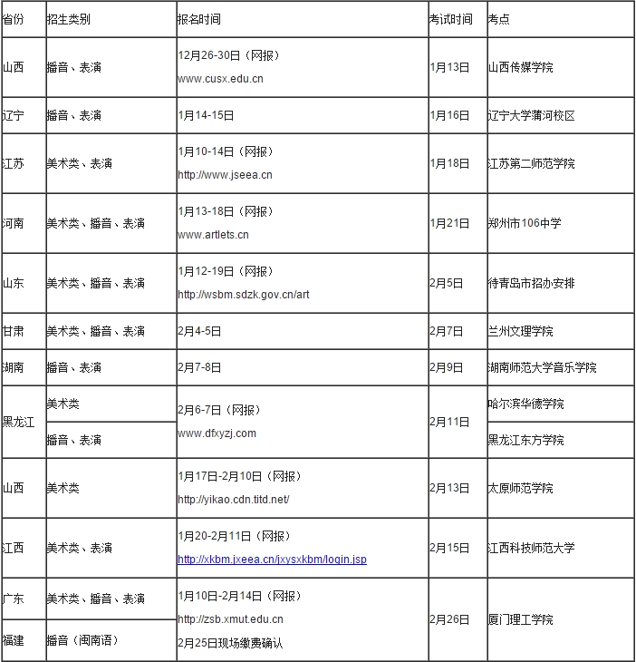 2017年我校藝術類專業考試分別在山西、遼寧、江蘇、河南、山東、甘肅、湖南、黑龍江、江西、廣東、福建等十一個省份設立“校考”考點,廣東省、福建省考點設在我校,其余省份考點均安排在所在省考試院(招生辦)指定考點。