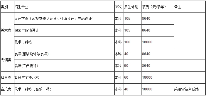 視覺傳達設計專業、環境設計專業、產品設計專業、服裝與服飾設計專業、藝術與科技專業,其中視覺傳達設計專業、環境設計專業、產品設計專業按設計學類招生,進校后分專業。