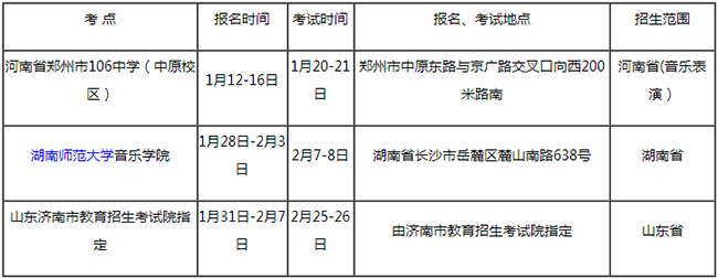 符合我校音樂表演、舞蹈表演專業報考條件的考生,按招生計劃中“特別提示”中的要求,按規定時間選擇考生條件符合的一個考點到現場參加專業課報名考試,不接受函報。不得跨點、多次參加考試,否則成績無效。