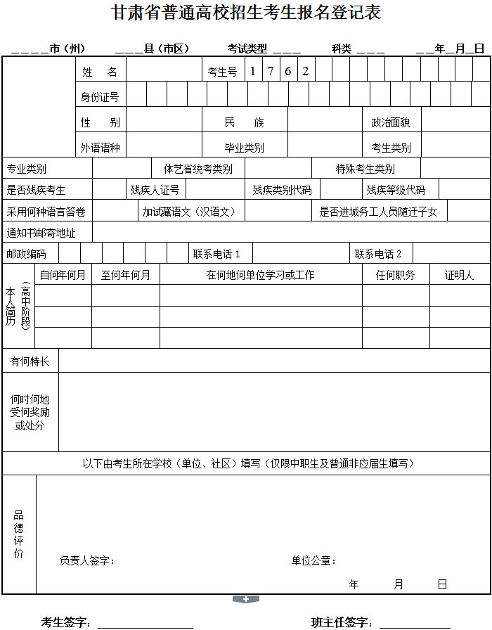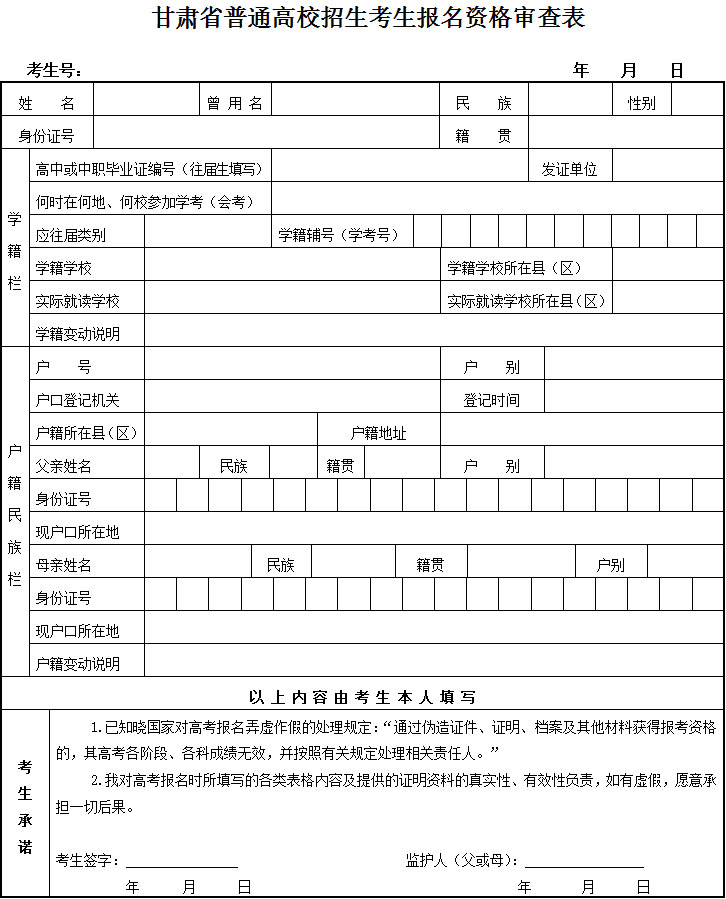 2.報名時,考生須填寫《甘肅省普通高校招生考生報名登記表》(詳見附件1)、《甘肅省普通高校招生考生報名資格審查表》(詳見附件2),經(jīng)相關(guān)部門審查確認(rèn)后交戶籍所在縣(區(qū))招生辦。