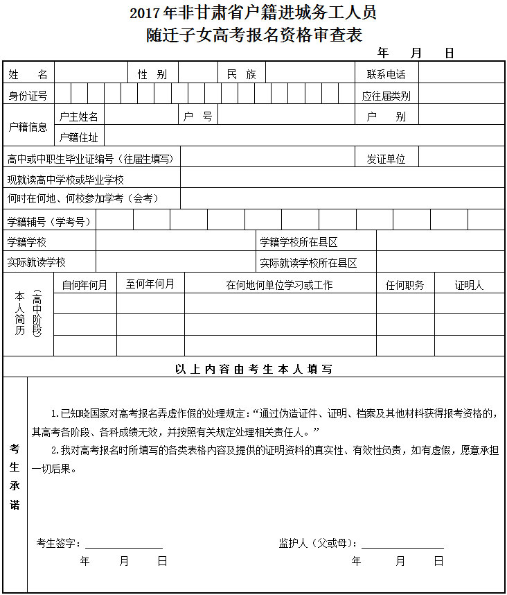 4.非我省戶籍進(jìn)城務(wù)工人員隨遷子女除填寫《甘肅省普通高校招生考生報名登記表》外,還須填寫《2017年非甘肅省戶籍進(jìn)城務(wù)工人員隨遷子女高考報名資格審查表》(詳見附件3)。