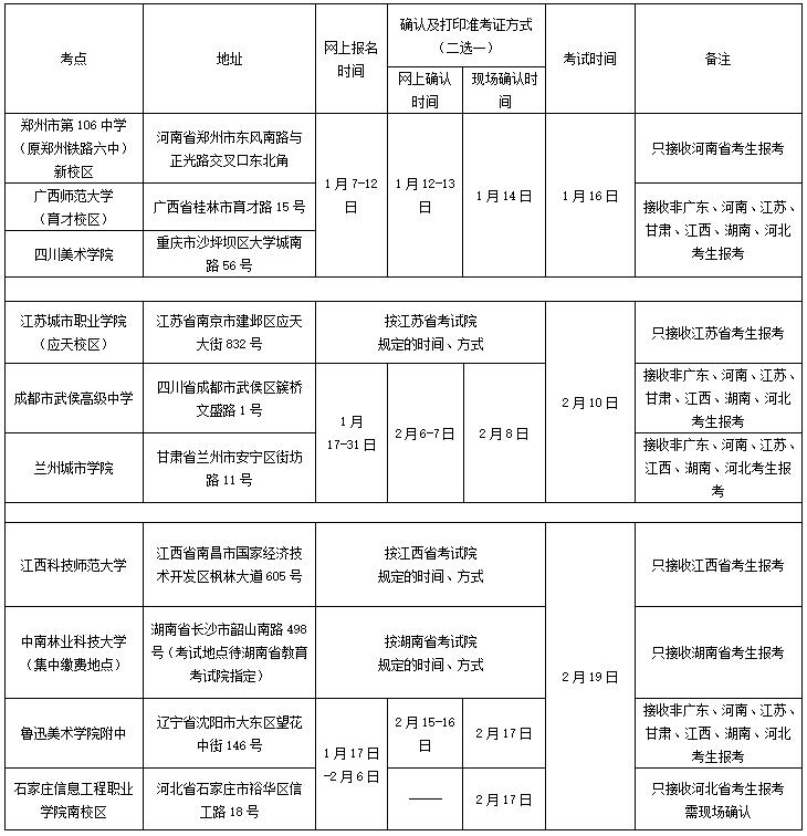 1、我校各美術類??紝I(yè)(除美術學專業(yè)、書法學專業(yè))在廣東省外設有十個考點,分別安排在三個時間段組織考試,考點安排如下: