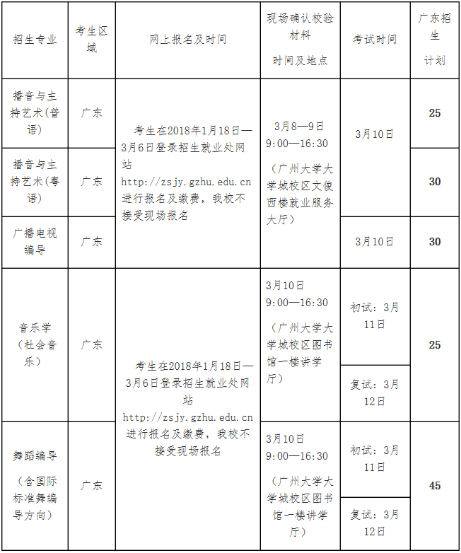 我校2018年面向廣東考生組織藝術類專業校考的專業有:播音與主持藝術、廣播電視編導、音樂學(社會音樂)、舞蹈編導共計四個專業。