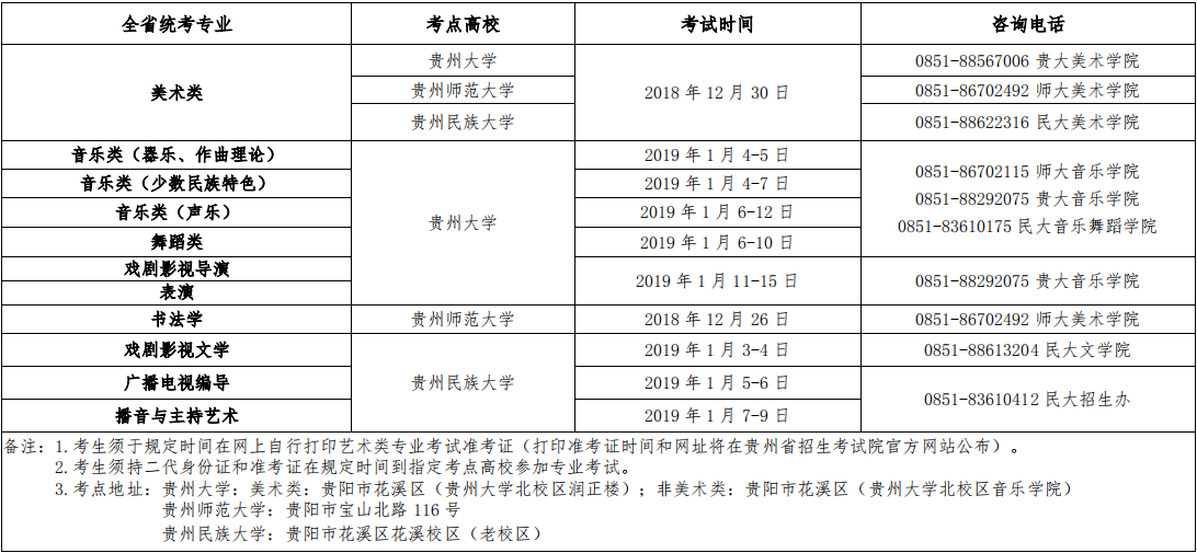 專業(yè)統(tǒng)考報(bào)名及考試時(shí)間、地點(diǎn)安排詳見(jiàn)貴州省招生考試院網(wǎng)站發(fā)布的《貴州省2019年普通高等學(xué)校藝術(shù)類專業(yè)考試時(shí)間表》。