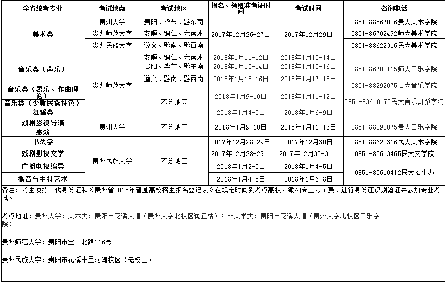 貴州省2018年普通高等學校藝術類專業考試時間表