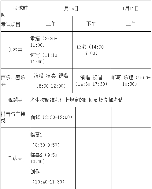 2. 考生需按專業考試要求攜帶考試用具。參加美術類的考生需自帶畫板、畫筆等用品;參加書法類考試的考生需自帶毛筆、墨汁、畫氈等用品;參加聲樂類考試的考生需自備演唱歌曲的樂譜;參加器樂類考試的考生需自帶樂器;參加舞蹈類的考生需自備舞蹈表演的CD伴奏音樂,并按照準考證上規定的時間到場參加考試。
