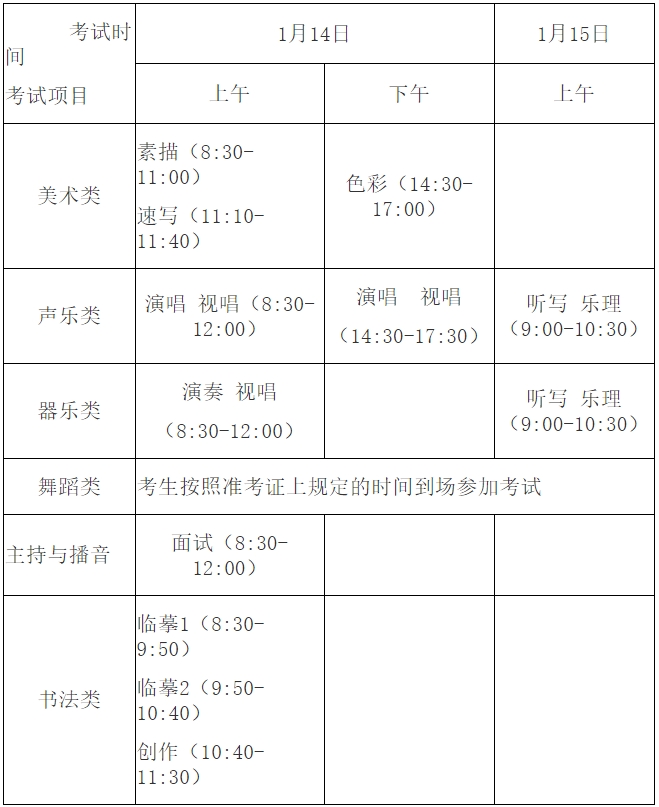 報考藝術類專業考試的考生須先參加藝術類的專業考試,再參加6月7日至9日文史類的普通高等學校招生全國統一考試(文化考試)。其中,藝術類專業的省級統考安排如下: