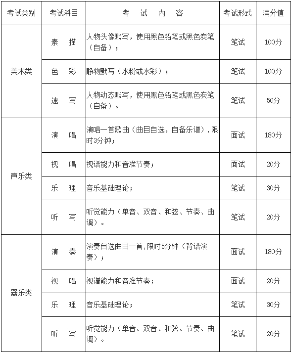 2.海南省2017年藝術類專業統一考試科目、內容及分值表
