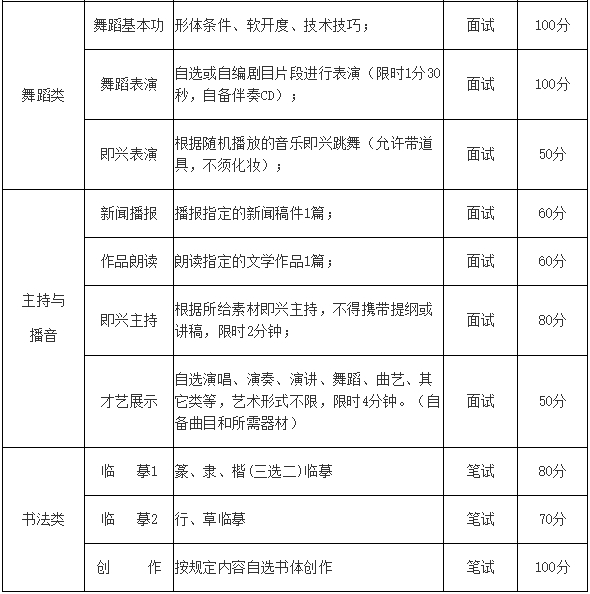 5.主持與播音類專業考試科目:新聞播報、作品朗讀、即興主持、才藝展示。