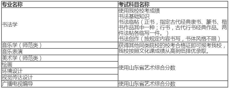 5、校考專業(yè):書法學(xué)(音樂學(xué)、音樂表演專業(yè)使用其他同類院校校考成績,廣播電視編導(dǎo)、美術(shù)學(xué)、繪畫、環(huán)境設(shè)計、視覺傳達設(shè)計、工藝美術(shù)專業(yè)使用山東省藝術(shù)綜合分數(shù))