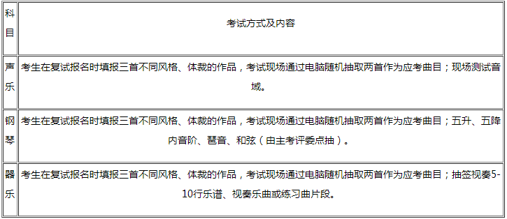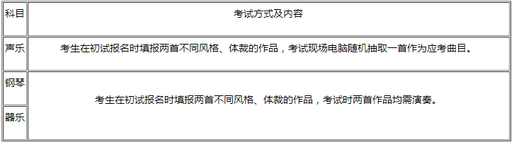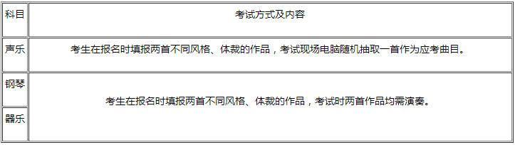 聲樂(必考)、鋼琴/器樂(在鋼琴、器樂中任選一項參加考試,器樂考試不包含鋼琴)