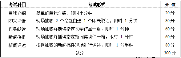播音與主持藝術專業考試共 5 個科目。綜合考察考生的外形條件、形象氣質、聲音條件、語言表達、綜合感受及思維反應等能力。考試科目和分值分布如下: