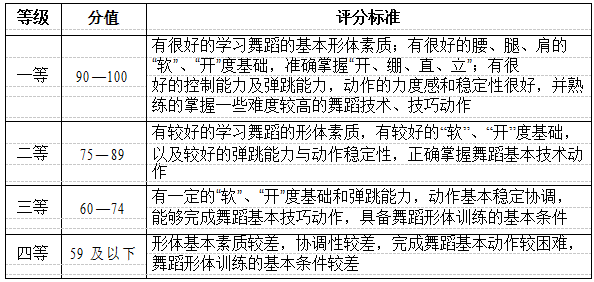考查考生形體條件,身體各部分軟開度,彈跳能力,要求考生具有體態(tài)勻稱、五官端正、健康挺拔、氣質好的形體條件;軟開度好,彈跳能力強;
