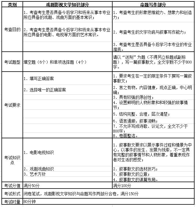 2、廣播電視編導專業:筆試。筆試分為上、下兩半場進行,上半場時長90分鐘,內容為綜合知識及命題編故事;下半場時長120分鐘,內容為影視作品分析。上半場與下半場之間休息15分鐘。