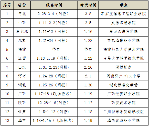 1、2018年我校在河北、山西、黑龍江、江蘇、福建、江西、山東、河南、湖北、廣西、陜西、甘肅、海南等13個省份組織藝術專業校考。