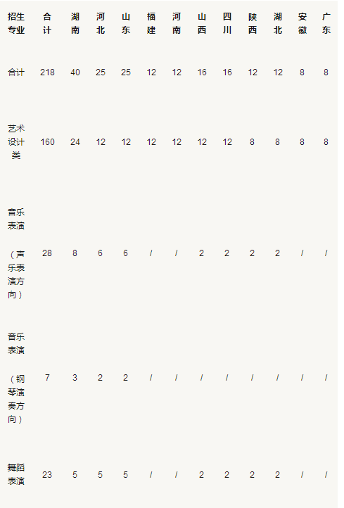 音樂舞蹈類招生計劃總數為58名,只招文科,按照專業招生、專業培養,學生進校后不參與專業分流,不能轉換專業。在湖南、河北、山東3省根據專業校考成績招生,在山西、四川、陜西、湖北4省根據省級統考成績招生。