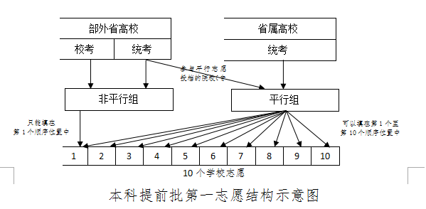 2、志愿結構和投檔辦法的變化。將本科提前批2個順序志愿中的第一志愿由單個志愿擴充為10個學校志愿。相應的投檔辦法也調整為分兩步進行。第二志愿不變,仍設1個學校志愿。