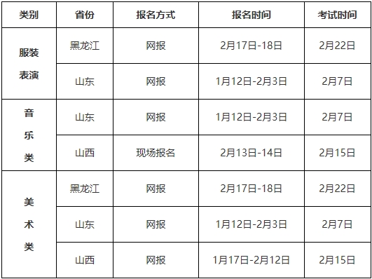 (2)黑龍江省:美術類(校考)專業只招文科考生,表演(校考)專業文理兼招;山東省:美術類(校考)專業、音樂類(校考)專業只招文科考生,表演(校考)專業文理兼招;山西省:美術類(校考)專業、音樂類(校考)專業文理兼招。各省參加校考的考生只能在所在省指定地點報名考試;