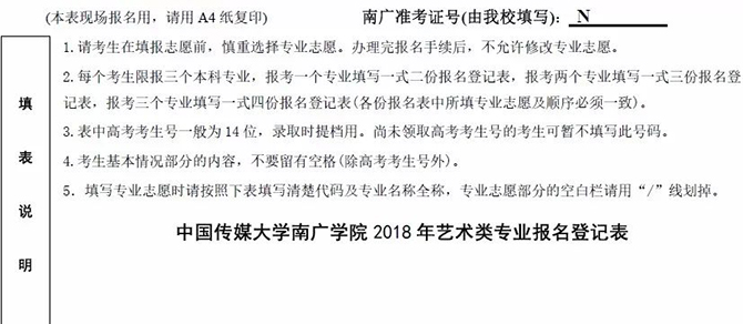 登錄中國傳媒大學南廣學院招生網下載,或在規定的報名時間到報名現場領取。報名表份數根據“所報專業個數+1”填寫。如報考1個專業填寫一式兩份報名表,報考2個專業填寫一式三份報名表,報考3個專業填寫一式四份報名表。每份報名表內容要完全一致,否則無效。請慎重選擇所報專業志愿,辦理完報名交費手續后不得修改志愿。