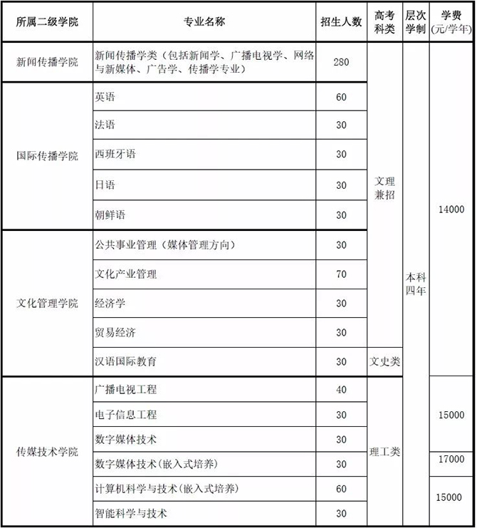 說明:1.以上專業均文理兼招。2.此招生計劃和學費標準只用于招生宣傳,如有變動以主管部門審批結果為準。