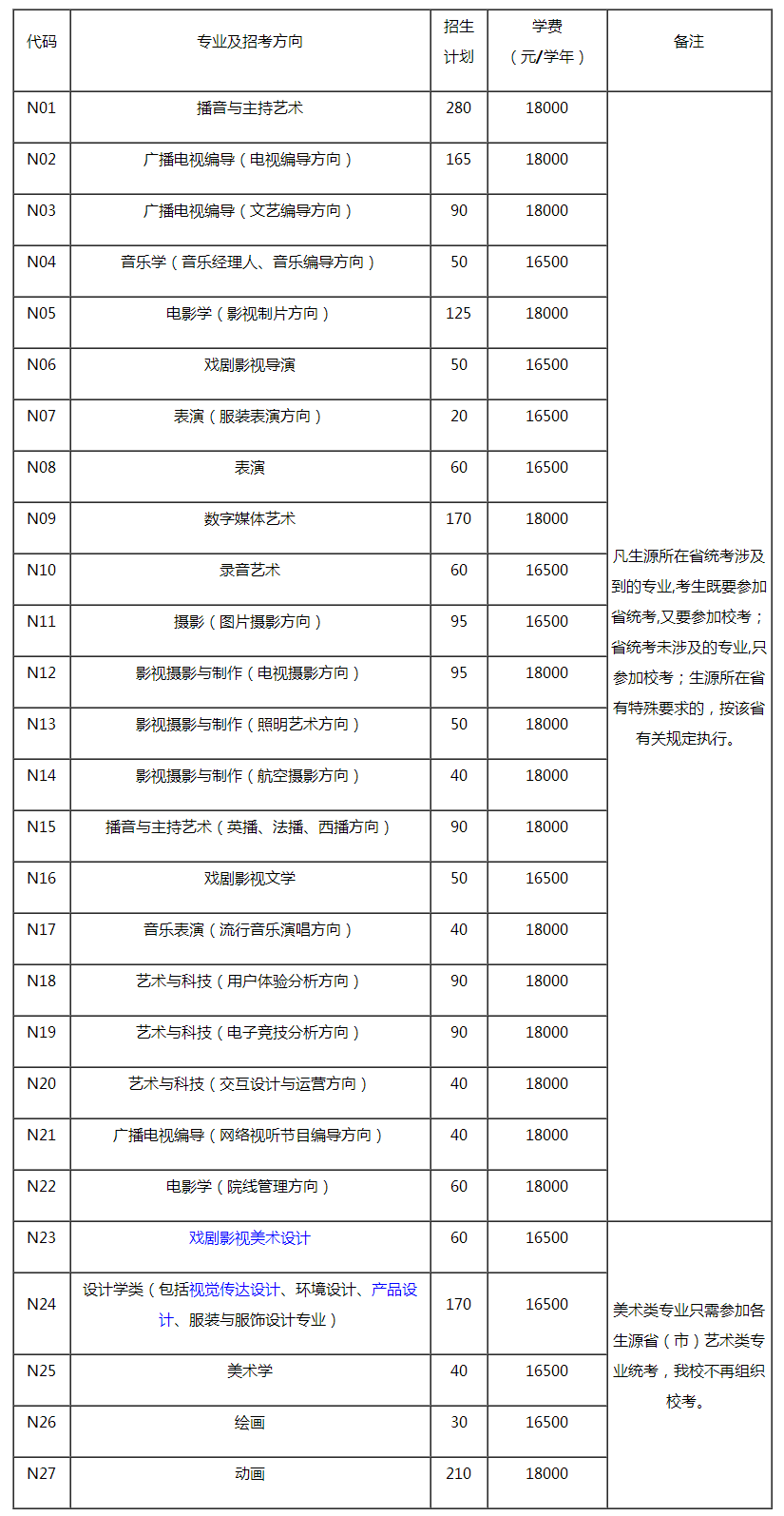 藝術類專業招生計劃及學費