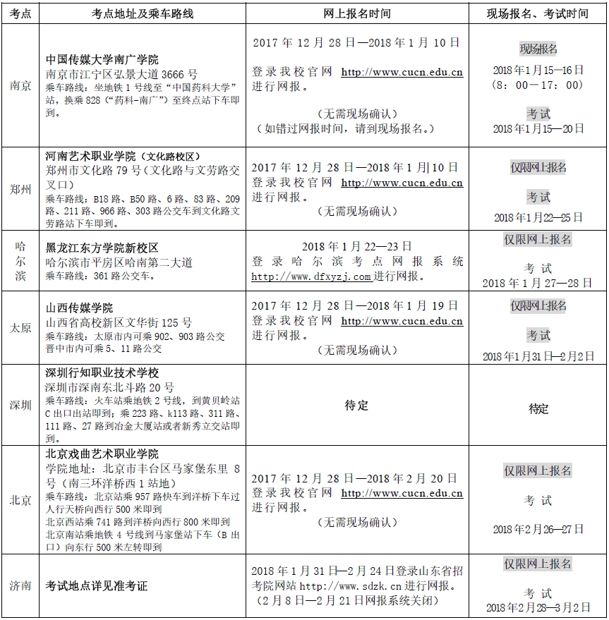 (二)2018年我校藝術類專業考試在南京、鄭州、哈爾濱、太原、深圳、北京、濟南設立??伎键c;擬在南昌設立新考點。