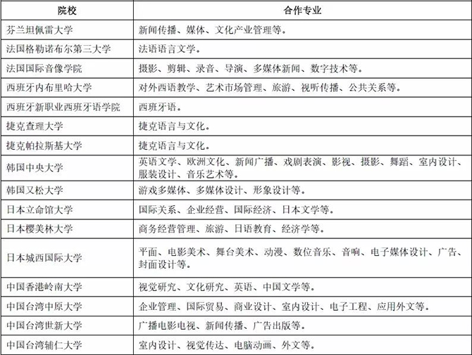 積極拓展國際交流與合作,與美國、加拿大、英國、新西蘭、法國、西班牙、意大利、韓國、日本、芬蘭、捷克等11個國家和地區40多所境外知名大學建立了校際合作關系,開展校際交流、短期交換生、本科及碩士預科等多類型項目合作,為師生搭建留學深造、學術交流、專業實踐等平臺,已累計輸送2000余名學生到境外學習深造或實踐交流。境外合作院校均為教育部備案院校和全球傳媒與藝術領域知名院校,合作院校優勢專業在本國乃至世界排名前茅,合作專業已覆蓋我校90%的學科專業,合作院校數量和層次保持國內同類院校前列。