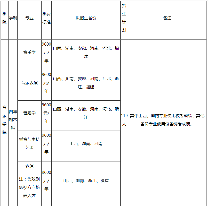 (注:①各省具體招生專業與計劃,以各省招生主管部門公布的信息為準;②參加學校組織專業考試人數較多的省份將適度增加招生計劃;③收費標準以物價部門的批準結果為準。)