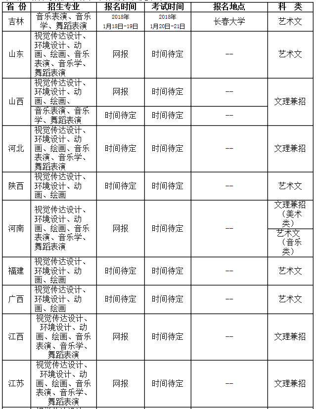 美術(shù)類專業(yè):山東、山西、河南、河北、江蘇、江西、陜西、甘肅、福建、廣西、吉林(吉林籍考生使用省專業(yè)統(tǒng)考成績(jī))。